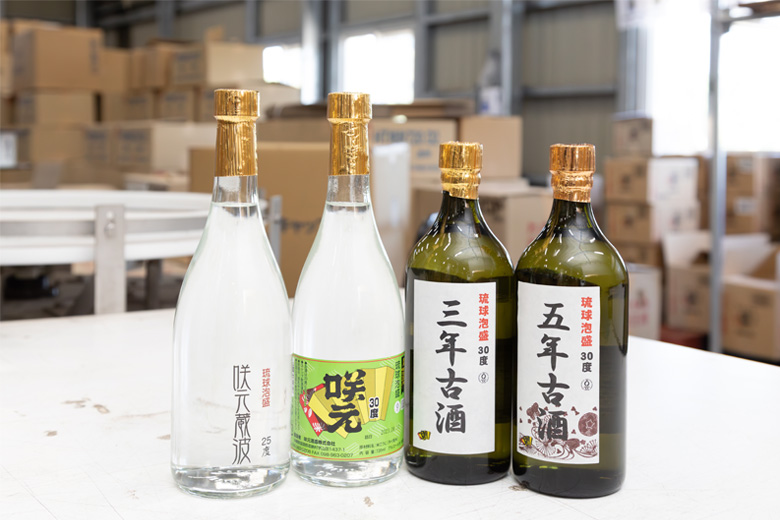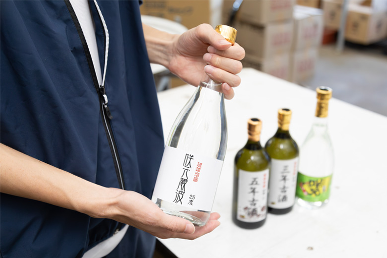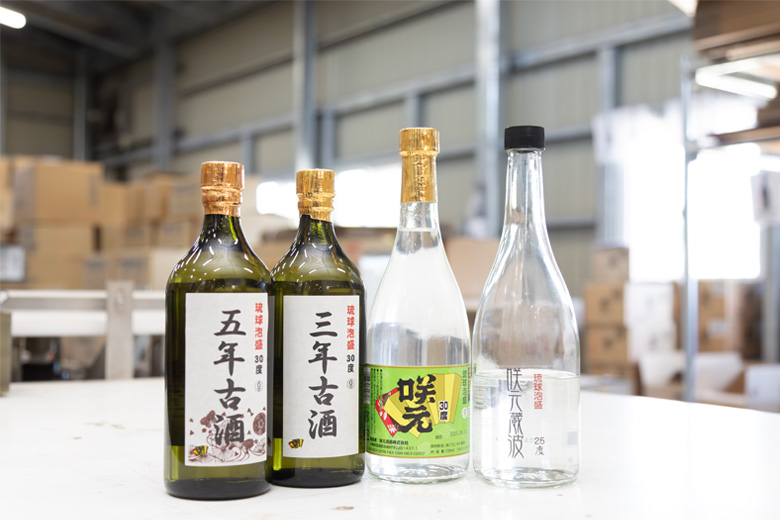 「咲元酒造では、首里工場で製造・仕次ぎ貯蔵した泡盛を継承した『咲元復刻ラベル』(25度、30度の2種類)や、三年古酒、五年古酒、濾過を控えて瓶詰めした粗濾過泡盛などを製造販売しています。定番の『咲元復刻ラベル』はのど越しがスムーズでマイルドな味わいが特長です。古酒の方は、じっくり貯蔵した自慢の原酒を使っていて、ほど良い甘みが人気の商品です」