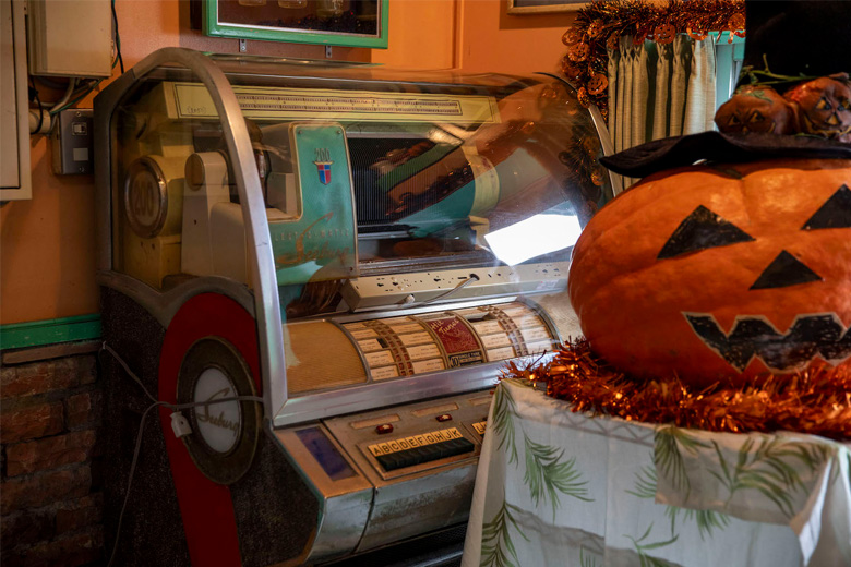 ジャックオーランタンの陰に隠れていたのは年代物のジュークボックス。