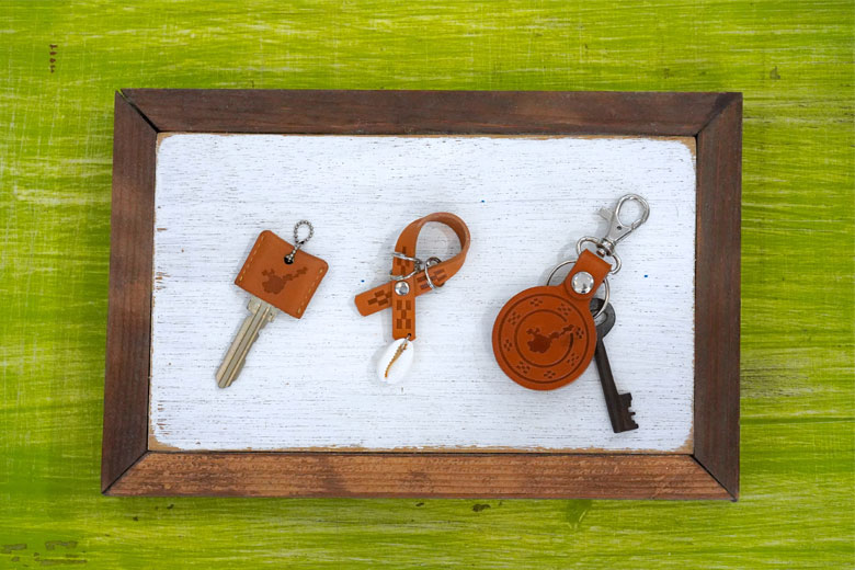 ミンサー柄と石垣島の模様が施されたキーホルダーは使うほどに革の質感が変わり、色合いに深みが増し艶やかになります。