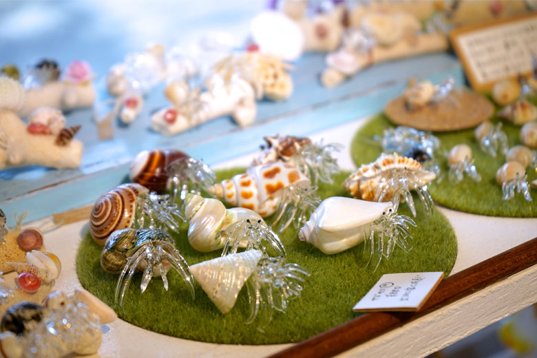 貝殻を背負った愛らしいガラスのヤドガリもサンゴツリーが製造元へ発注してつくっている人気の商品です。