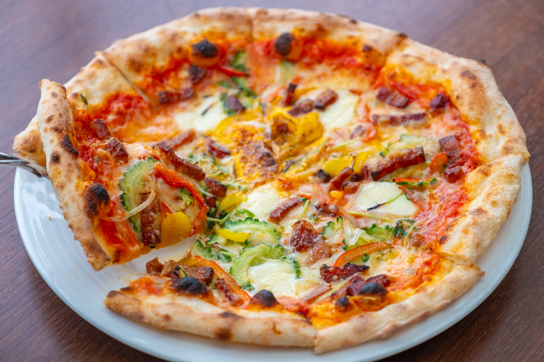 イタリア産や宮古島産のこだわり食材をたっぷりと乗せたピッツァは、およそ600度の石窯で急速に焼き上げることで、外はパリッと中はもちもちの食感に仕上がります。