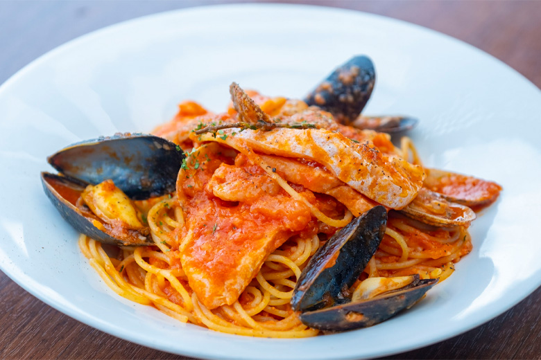 海をイメージした海賊風トマトソースのパスタ「ブカニエラ」は、サーモンやエビなどの5種類の魚介類を使用。