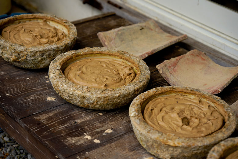 掘井さんが作るやちむんは、石垣島の粘土を基本に、窯の火が極端に強い場所には耐火性のある本土の土を混ぜて使っています。