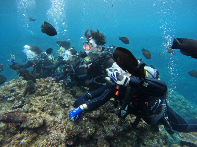 石垣島のマンタスポット『川平石崎マンタスクランブル』では、ウェットスーツを着用してショップのプランに参加する事によって、シュノーケリングでもマンタウォッチングを楽しむ事が出来ます!そしてさらにオススメは、ダイビングでの水中マンタウォッチング!間近で見る野生のマンタの姿は感動的です。ダイビングのお試しプログラム「ディスカバースクーバダイバーコース」と組合せたプランに参加する事で、ダイビングのライセンス(Cカード)がなくても、水中でのマンタウォッチングに参加する事が出来ます!