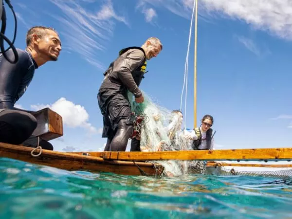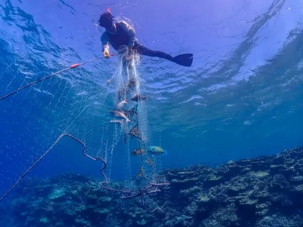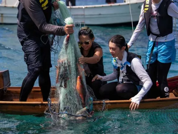 通常、網での漁は漁業権により制限されていますが、当ツアーでは海人(漁業者)が指導するため、一般の方でもご参加いただけます。