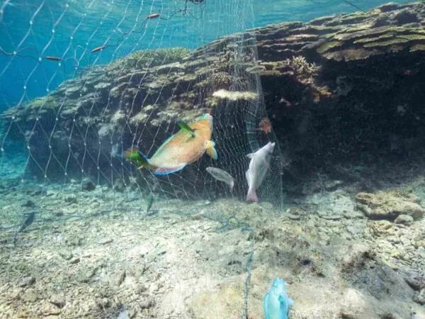 ワリと呼ばれるサンゴ礁の溝(割れ目)の出口に網を仕掛け、浅瀬から泳いで魚を驚かせ網へ追い立てます。