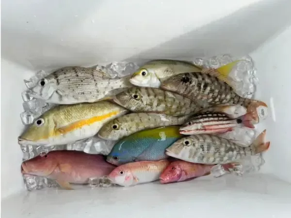 イカの切り身をエサにミーバイやフエダイなどいろいろな沖縄の魚が釣れます。