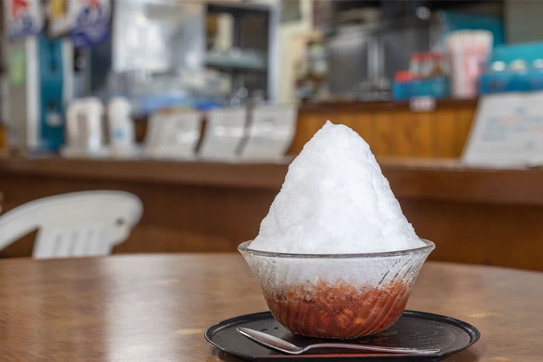 6種類(アイスぜんざい・いちご氷・いちご金時・ミルク金時・いちごミルク氷・いちごミルク金時)の中でも、地元の常連客から支持されているのがアイスぜんざい。