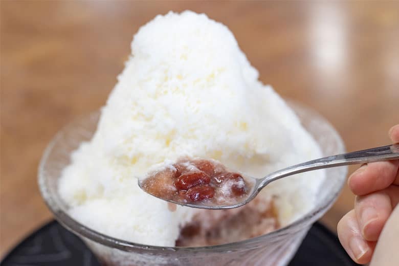 サラサラでふわっとした食感の氷の下には甘く煮た金時豆が。