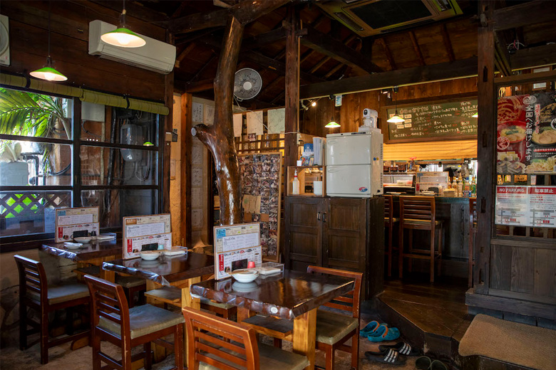 雰囲気のある古民家で、沖縄食材をふんだんに使った料理と、おいしい泡盛や古酒、さらに名物ラーメンまで楽しめる「きんぱぎんぱ」。