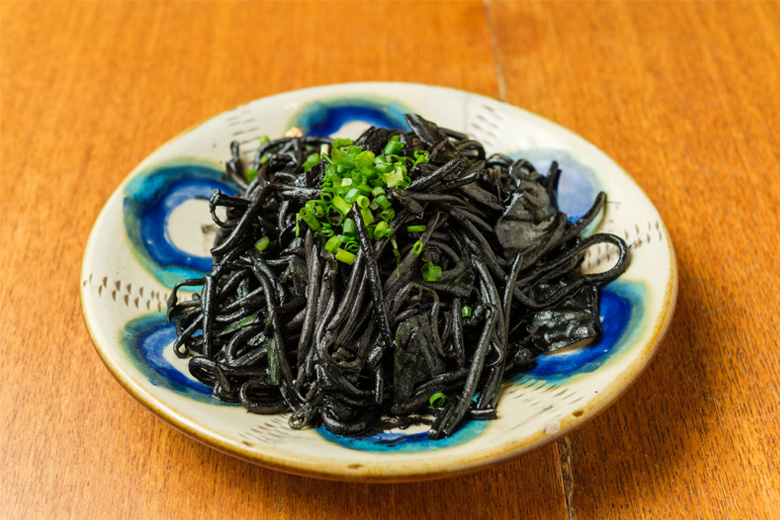 この麺は焼きそばにも適しており、さらに味と香りが濃厚なイカスミともよくからんで大変美味。クセになりそうです。