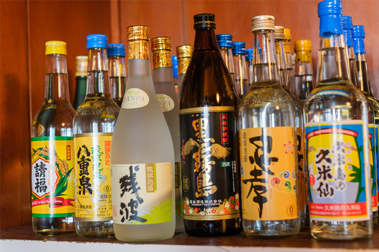 八重泉や請福といった八重山の泡盛をはじめ、本島や離島の泡盛・焼酎など、多彩なお酒をそろえています。
