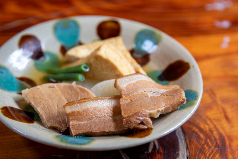 豚の三枚肉と赤肉(ロース)、島豆腐の厚揚げ、大根、インゲンが入った「煮付450円」はカツオの一番出汁の旨みが効いています。