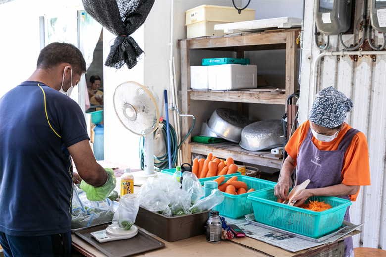 身内の方が多いというスタッフさん達で和気あいあいとした調理場では、かき揚げで使うにんじんシリシリや、アーサなどの具材を仕込み中。