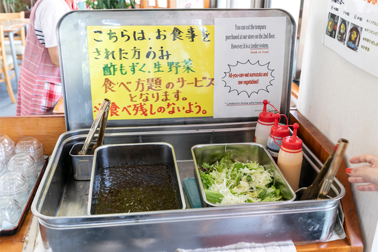 時枝さん一家が養殖している奥武島産の酢もずくと、生野菜サラダがセルフサービスで食べ放題です。