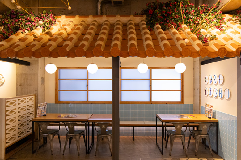 こちらの半個室には、赤瓦屋根とブーゲンビリアがあしらわれ、まるで沖縄の古民家にいるような気分を味わえます。