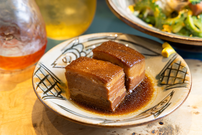 沖縄では三枚肉と呼ばれる豚バラ肉のかたまりを、泡盛と砂糖、醤油でじっくり煮込んだラフテーはトロトロのほろほろ。