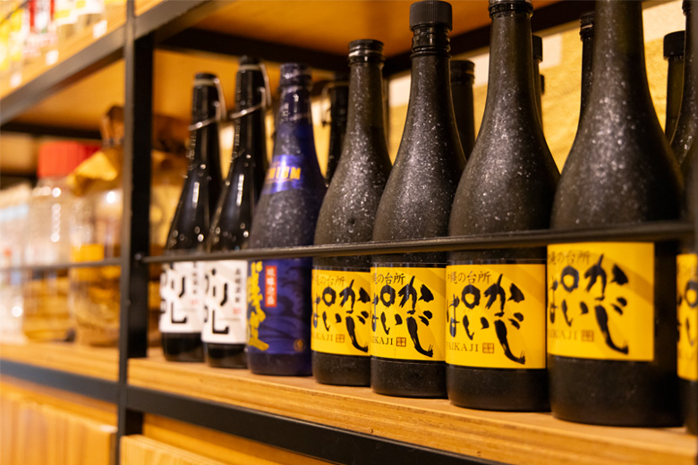 壁一面を埋めつくすように並ぶ泡盛は、圧巻の品ぞろえ!