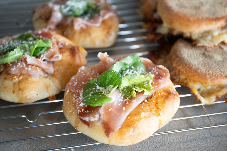 木々に囲まれた場所で陽の光を浴びながら、たくさんのパンがずらりと並んでいます。