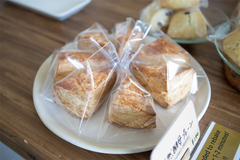 四角形のザクザク食感スコーンは、定番スコーンのように丸くして販売することもできますが、端っこが余ってしまうため、フードロス削減のために四角のまま提供しているのだとか。
