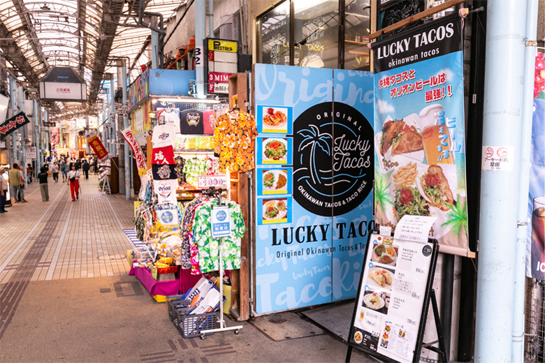 国際通りの中心・平和通り入り口にあるオキナワンタコス&タコライス専門店「LUCKY TACOS(ラッキータコス)」。