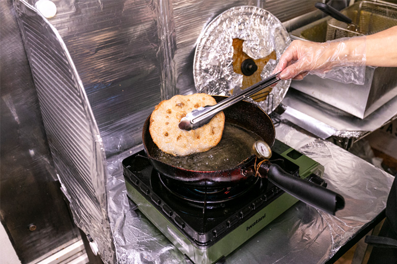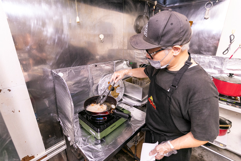 ラッキータコスでは“サクサク&もっちり”食感のタコス生地を提供するために、オープン当初からフライヤーは使わず、小さめのフライパンで1枚ずつ丁寧に揚げることを徹底。