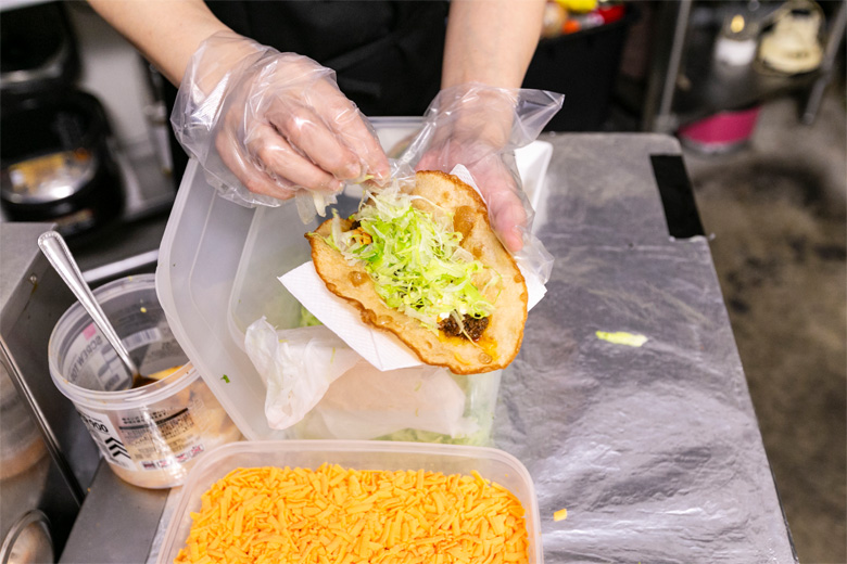 揚げたての皮の中に、秘伝のタコスミートにシャキシャキのレタス、チェダーチーズをたっぷりと、仕上げにカットトマトをのせたら完成。