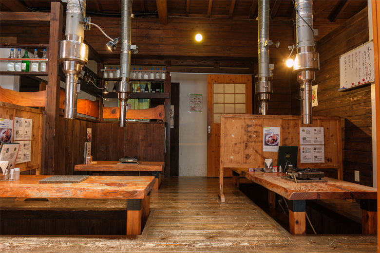 店内は木が多用されたインテリアで、炭火焼肉も提供するため、焼肉店のような雰囲気もあります。