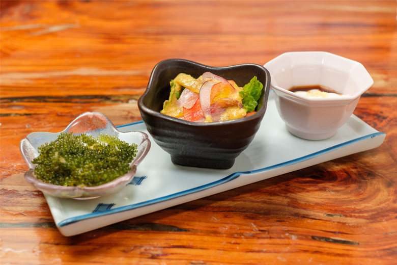 海ぶどうに野菜の和え物、そしてお店手作りのジーマーミー豆腐。