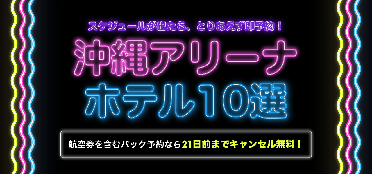 実は沖縄アリーナ周辺は、イベント終了後の渋滞や、タクシー・バスの混雑が深刻です。さらに、「チケットの当落がまだだから予約できない…」と迷っている間に、条件の良いホテルは埋まってしまいます。
