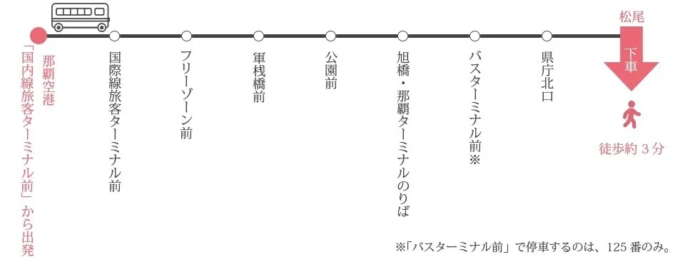 那覇空港国内線到着ロビー(1F)から外に出て、バスのりば ③ 「国内線旅客ターミナル前」より下記いづれかの系統バスに乗車、約18分で「松尾バス停」到着。