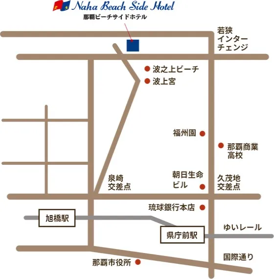 那覇ビーチサイドホテル までのアクセスは、那覇空港から那覇うみそらトンネルを経由して車で約10分。那覇バスターミナルと直結する沖縄都市モノレール「旭橋駅」はタクシーで約5分です。