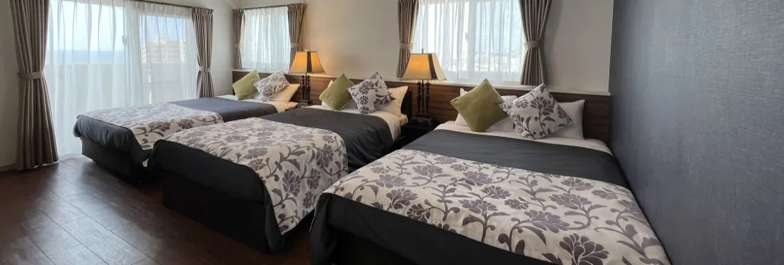 - お部屋は広々くつろげる46㎡、ベッドは140cm×195cmのダブルベッドが3台のファミリールームです。