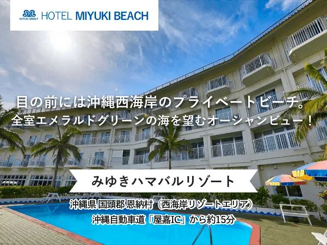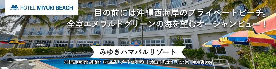 みゆきハマバルリゾート までのアクセスは、那覇空港から沖縄自動車道を経由して最短50分です。空港シャトルバスは120番名護西空港線で約120分の「冨祖(あふそ)」バス停下車、徒歩3分で到着します。