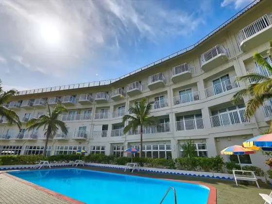 夜はカーテンを閉めないと大量の羽アリが飛んでくる^^;海もプールも楽しめて近くには美味しいガーリックシュリンプのお店もコンビニもあって充分楽しめた。
