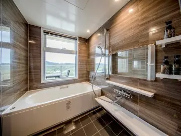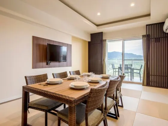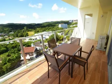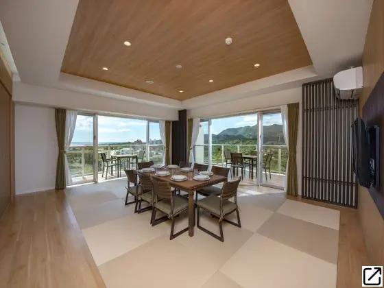やんばるの自然を一望する広々としたリビングとテラスは、角部屋ならではの魅力です。