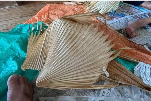 竹の骨組にクバ(和名:ビロウ)の葉3枚を被せ竹ひごで編み込みます。軽く硬く、その構造の精巧さや合理性に驚かされます。