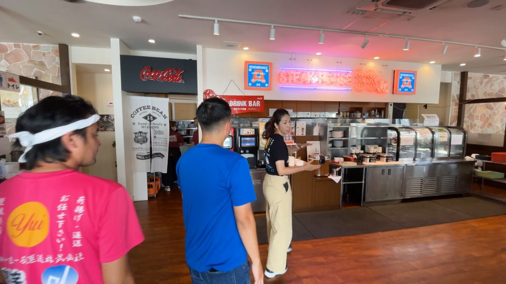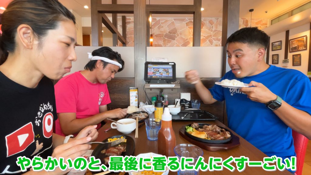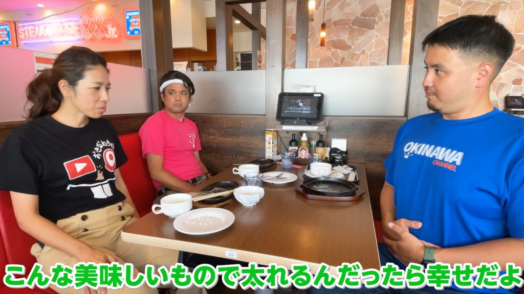 ステーキを注文すると、なんとスープ、サラダ、ライスが全て食べ放題!これには私たち「おきなわちゃんねる」のメンバーも大興奮。じゅん選手も「すごいでしょう?」と、このお得感に自信満々でした。