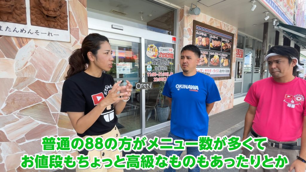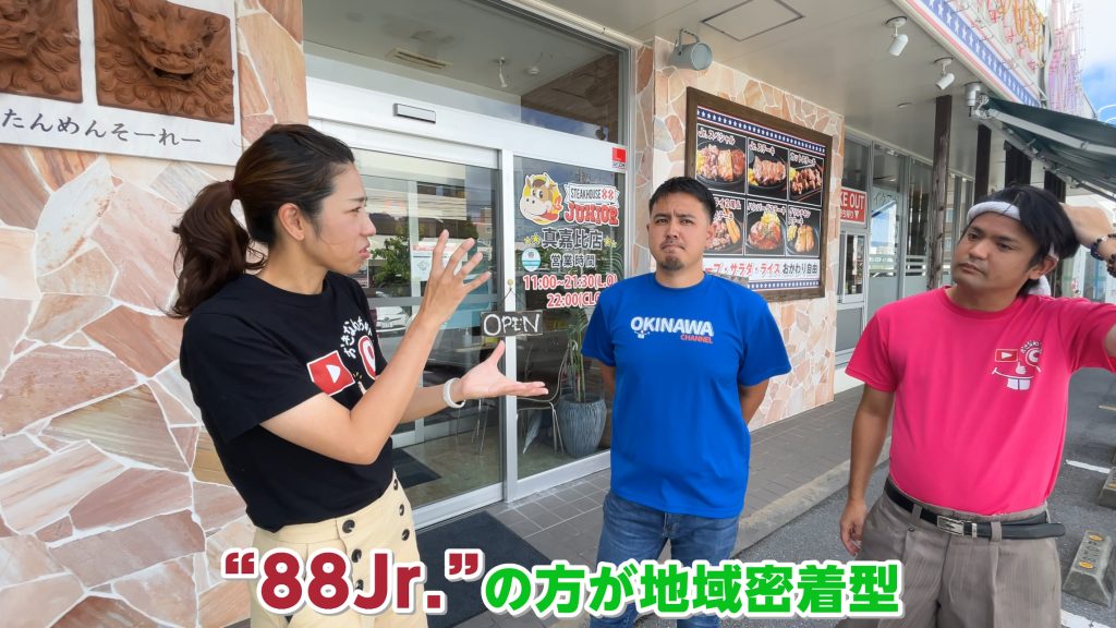 沖縄のステーキ文化を語る上で欠かせない「ステーキハウス88」。実は、お店の名前には「88」と「88Jr.」の2種類があることをご存知でしょうか?ひーとーも動画内で説明していましたが、「88Jr.」は「地域密着型」の店舗として展開されています。