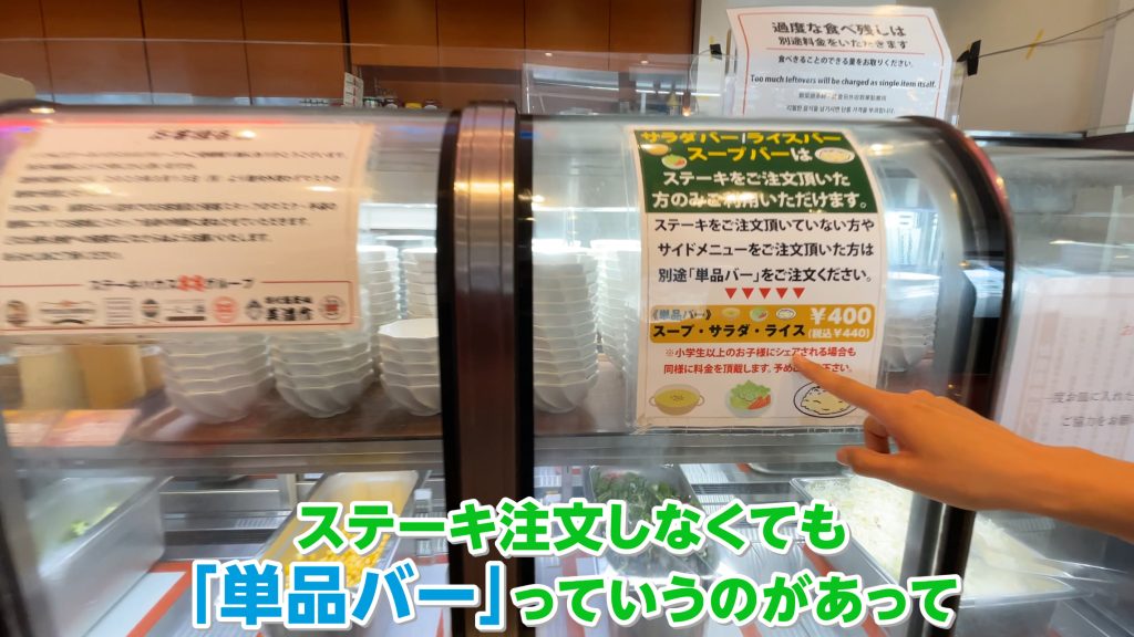 「ステーキを注文しない場合は?」という方もご安心ください。「単品バー」として、スープ・サラダ・ライス食べ放題を税込440円で利用することも可能です。この価格で、野菜もご飯も温かいスープも好きなだけ楽しめるなんて、まさに破格のコストパフォーマンスです!じゅん選手が思わず「安すぎない?」と漏らすのも納得の贅沢さです。