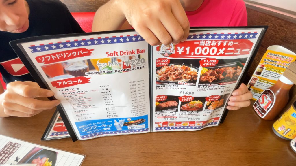 私たちが訪れた日はお昼時を過ぎた時間でしたが、店内は清潔感があり、広々とした空間でゆったりと過ごせます。アメリカンな雰囲気漂う内装は、まさに沖縄のステーキハウスといった趣で、入店した瞬間から食欲が掻き立てられます。