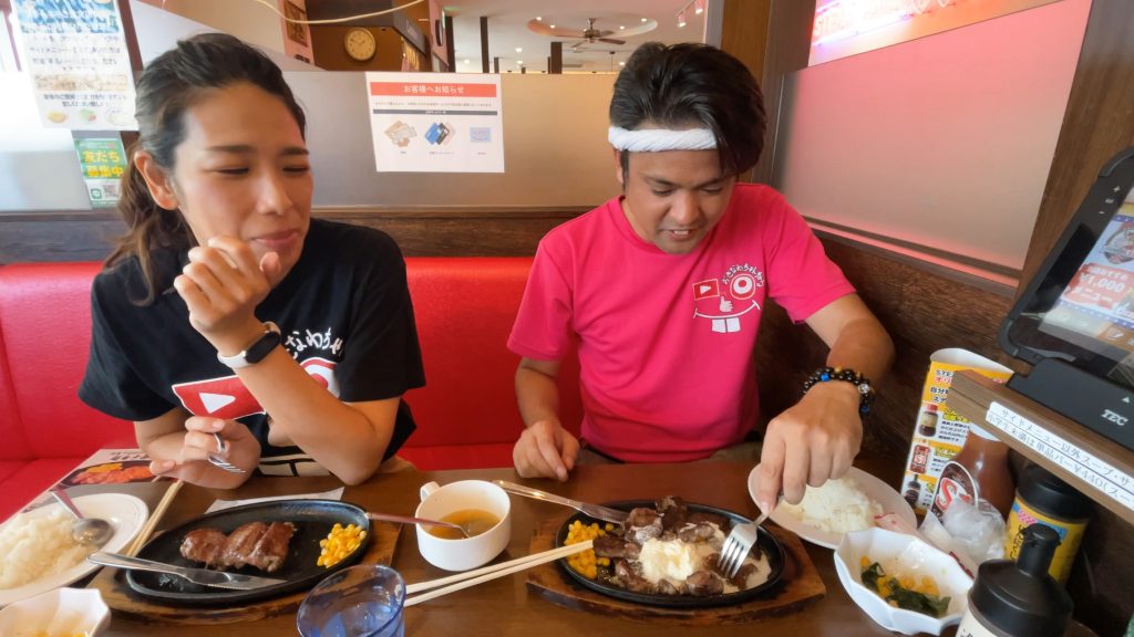 さらに驚くべきは、その肉の柔らかさ。なんとよな太郎は、ナイフを使わずにフォークだけで肉を切り始め、「ナイフいらないじゃん!」と一言。ひーとーも「やわらかかった今!」とその驚くべき柔らかさに目を丸くしていました。「牛の味がギュウ〜と凝縮されてる!」と肉の旨味が凝縮されていることを強調し、「全部やわらかい!」と、その品質の高さに感嘆。あまりの美味しさに、なんとご飯を2回もおかわりしていました。「温かいご飯が美味しいんで」と、鉄板の余熱で温められたソースとご飯の組み合わせは、まさに至福の味のようです。
