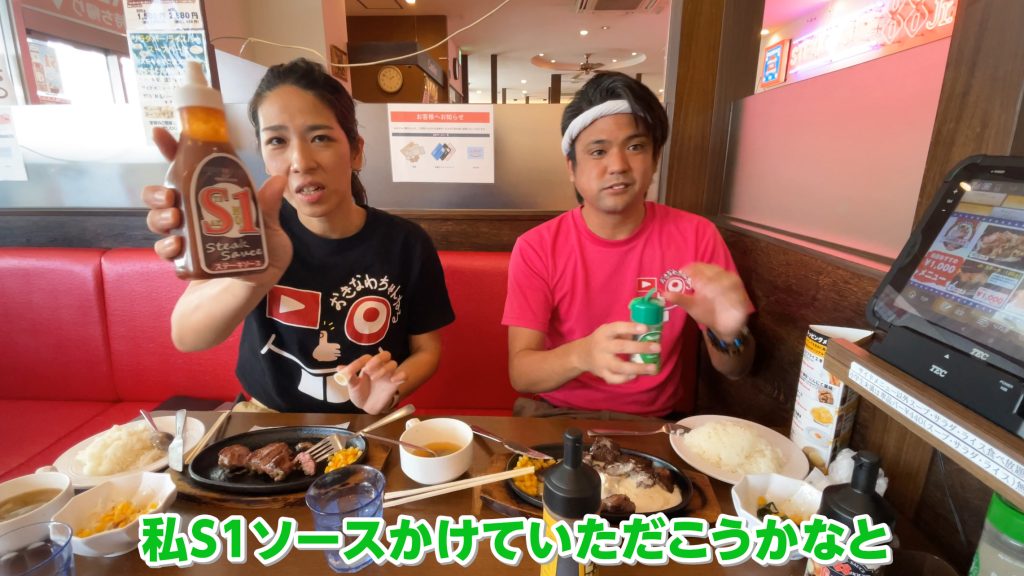 沖縄のステーキハウスの特徴の一つに、テーブルにずらりと並ぶ様々なステーキソースがあります。「A1ソース」が有名ですが、ステーキハウス88Jr.ではお店オリジナルの「S1ソース」も提供されています。よな太郎は普段A1ソース派だったそうですが、今回S1ソースに初挑戦。「S1ソース美味しい!ちょっとピリ辛!」と、その新しい味に舌鼓を打ちました。