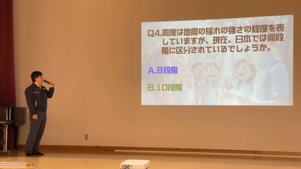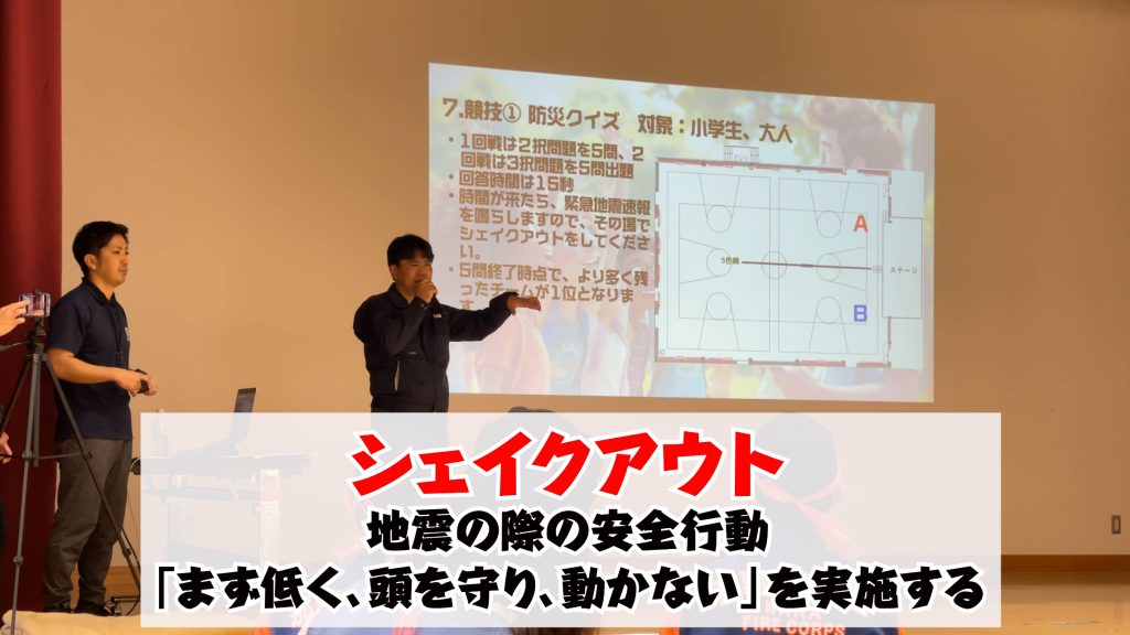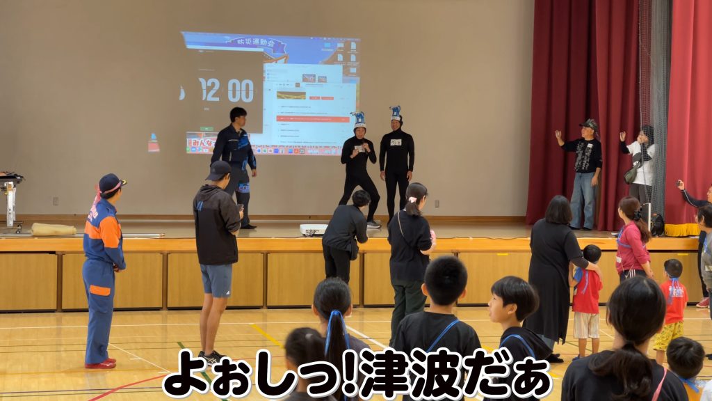 全員が「B」を選択し、見事正解!しかし、ただの〇✕クイズではないのが「TASUKE」の面白いところ。なんと、解答時間が終了すると同時に「緊急地震速報」が流れ、参加者全員がその場で「シェイクアウト(姿勢を低くし、頭を守り、動かない)」を実践するという、実践的な防災訓練が組み込まれています。子供も大人も一斉に身を守る姿は、もしもの時に備える意識の重要性を改めて教えてくれます。