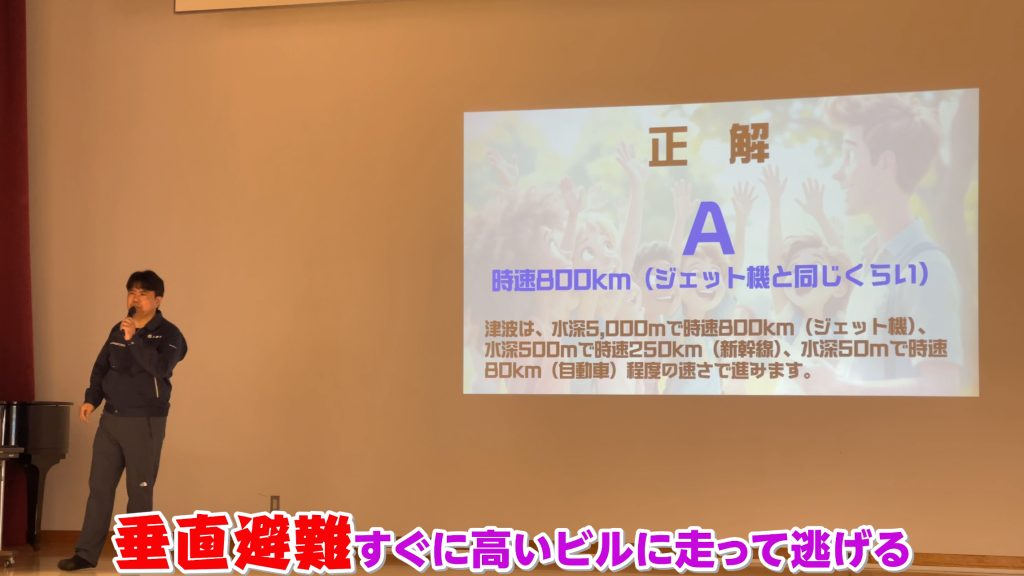 最初の競技は「防災クイズ」。地震や津波に関する知識が試される〇✕形式のクイズですが、これが一筋縄ではいきません。
