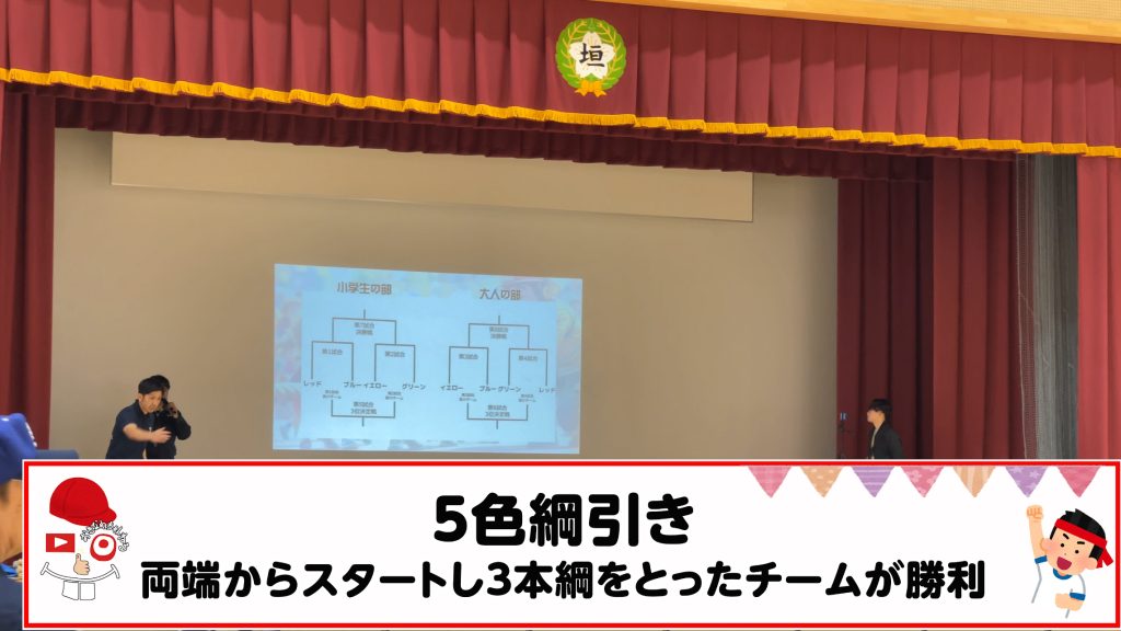 子供の部と大人の部に分かれての対決です。子供の部ではよな太郎の応援も虚しく赤チームは敗北してしまいますが、大人の部ではあつきにいにいとひーとーが参加し、見事赤チームが勝利を収めます。大人たちの意地が垣間見える白熱した戦いでした。