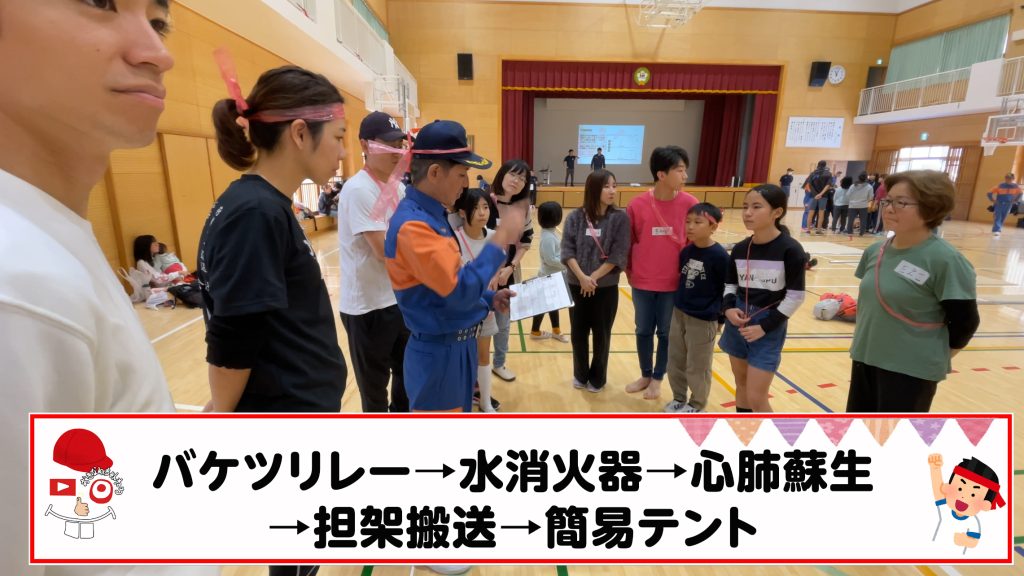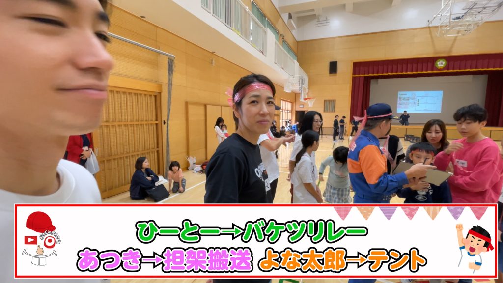 あつきにいにいは簡易担架でのダミー人形搬送で奮闘します。なんと「担架が崩れそうだった為作り直し」というハプニングが発生!しかし、安全第一で迅速に対応するその姿は、まさしく防災運動会の精神を体現しています。