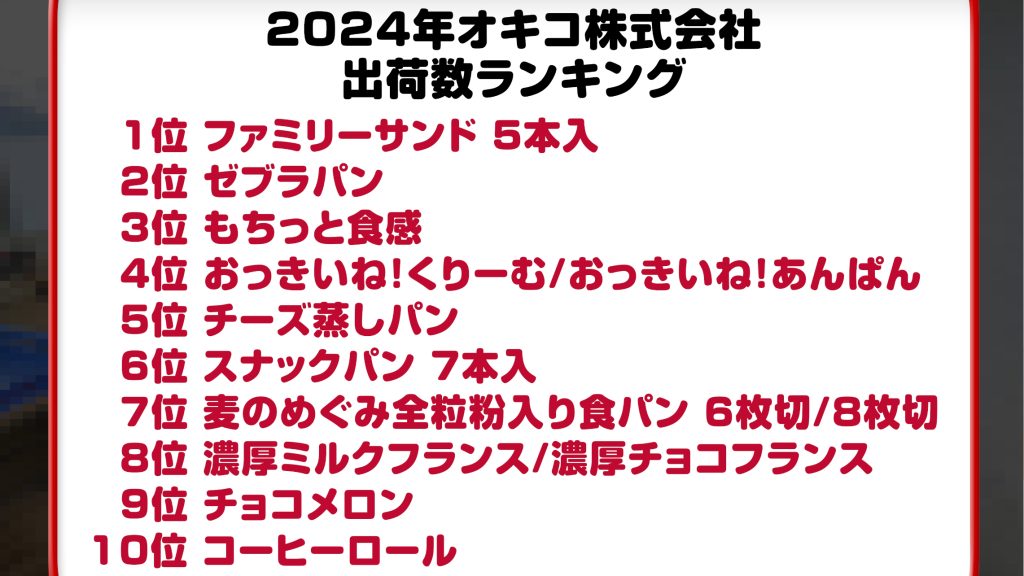 なんと、オキコのパンはレギュラー商品だけでも100種類以上、プライベートブランド商品も含めると約250種類もの商品があるんです。お二人の予想は的中するのか!?今回はオキコパンの年間出荷数ランキングTOP10を発表いたします!