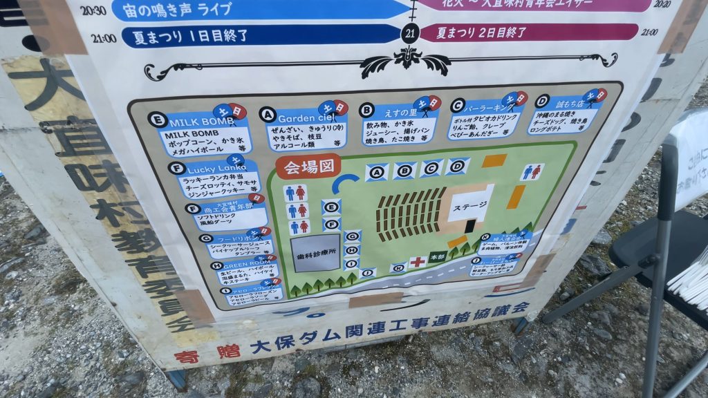 いよいよお祭りの会場へ潜入!入口の案内板には、ステージイベントのスケジュールや会場マップが掲載されており、美味しそうな屋台の情報も満載です。