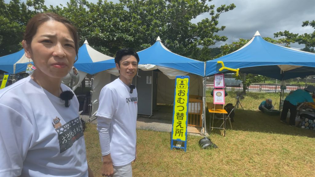 まず、あつきにいにいが注目したのは「おむつ替え所・授乳室」の設置。中には扇風機も設置されており、子ども連れでも安心して楽しめるよう、村の温かい配慮が感じられます。あつきにいにいも「大宜味村は子どもたちに優しい!」と感動の様子でした。